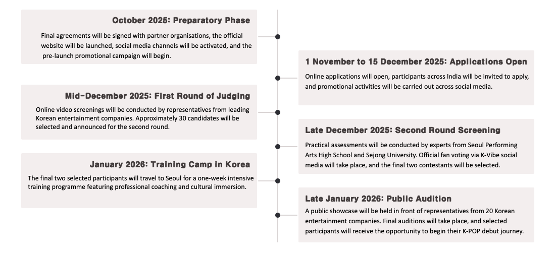 A large scale audition for youth aged 15 to 20 across India designed to evaluate dance, singing skills, star quality, and stage presence. This is your chance to showcase your talent and take the first step toward becoming a K-POP star.