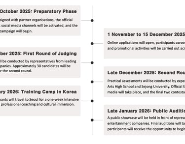 The top two finalists will travel to Seoul, South Korea, in January 2026 for a week long K-POP training program, gaining real experience and building friendships with current trainees. After evaluation by the industry panel, selected participants may continue their training in Korea, with all training and living expenses fully covered.
